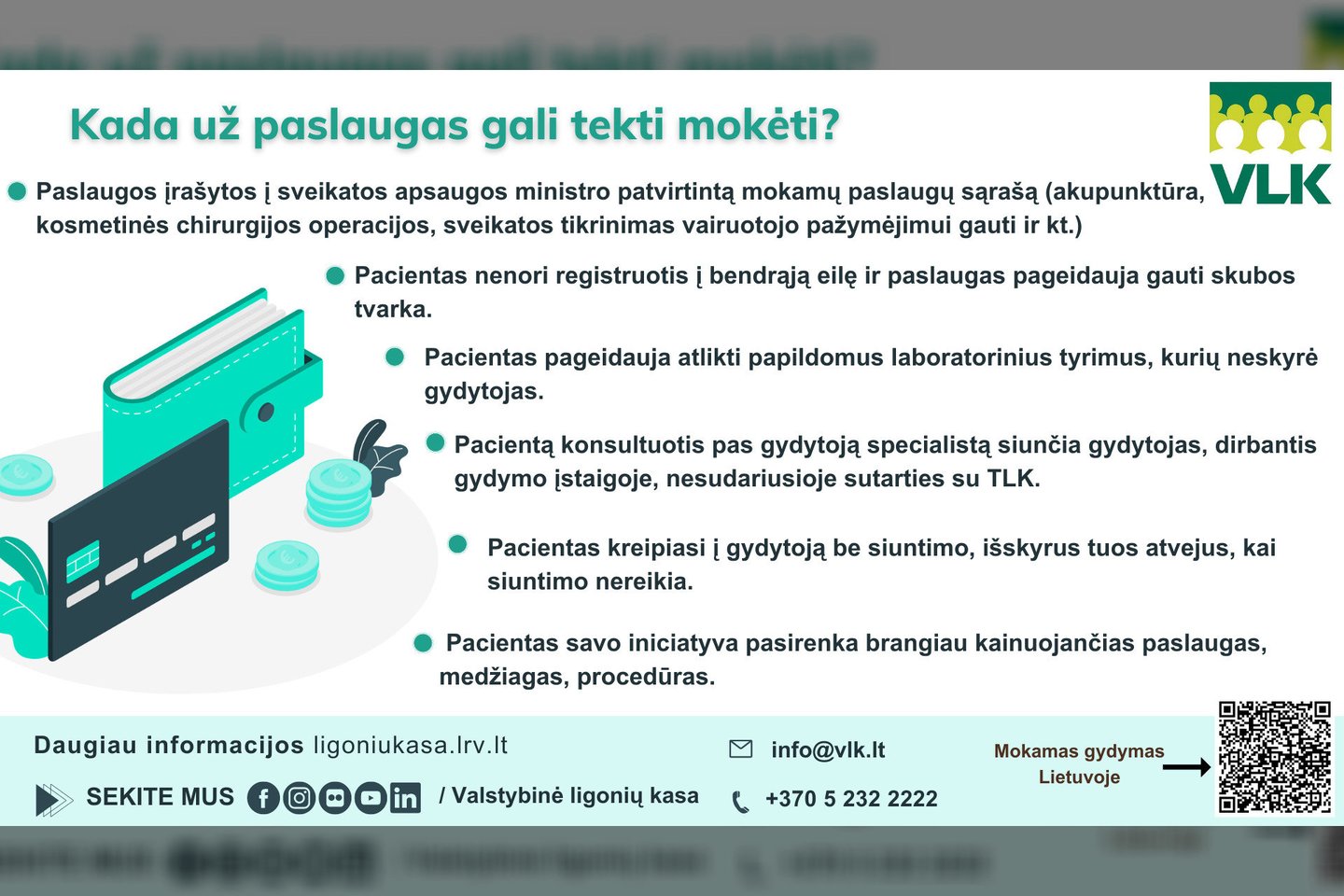 Taigi prieš mokant už medicinos paslaugas svarbu aiškintis dėl mokėjimo pagrįstumo. Jei gydymo įstaigos argumentai neįtikina, galima iškart pasitarti susisiekus su ligonių kasa.