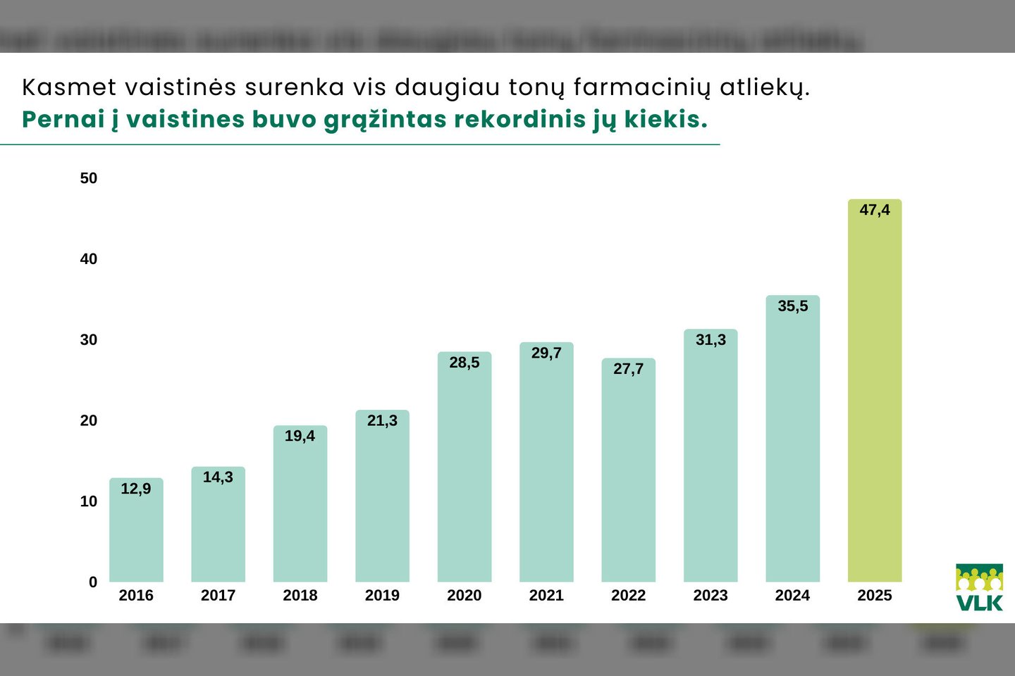 „Farmacinių atliekų kiekis Lietuvoje nuosekliai auga, o pastaraisiais metais – itin sparčiai. Pernai vaistinės surinko beveik 12 tonų daugiau vaistų, nei užpernai ir beveik 4 kartus daugiau nei, pavyzdžiui, prieš devynerius metus. Dabar per kelis mėnesius surenkama tiek pat farmacinių atliekų, kiek anksčiau vaistinės surinkdavo per visus metus. Tai rodo, kad vaistų grąžinimas tapo įprasta praktika, tačiau kartu atskleidžia ir tai, jog vaistai vis dar įsigyjami ne iki galo apgalvotai.