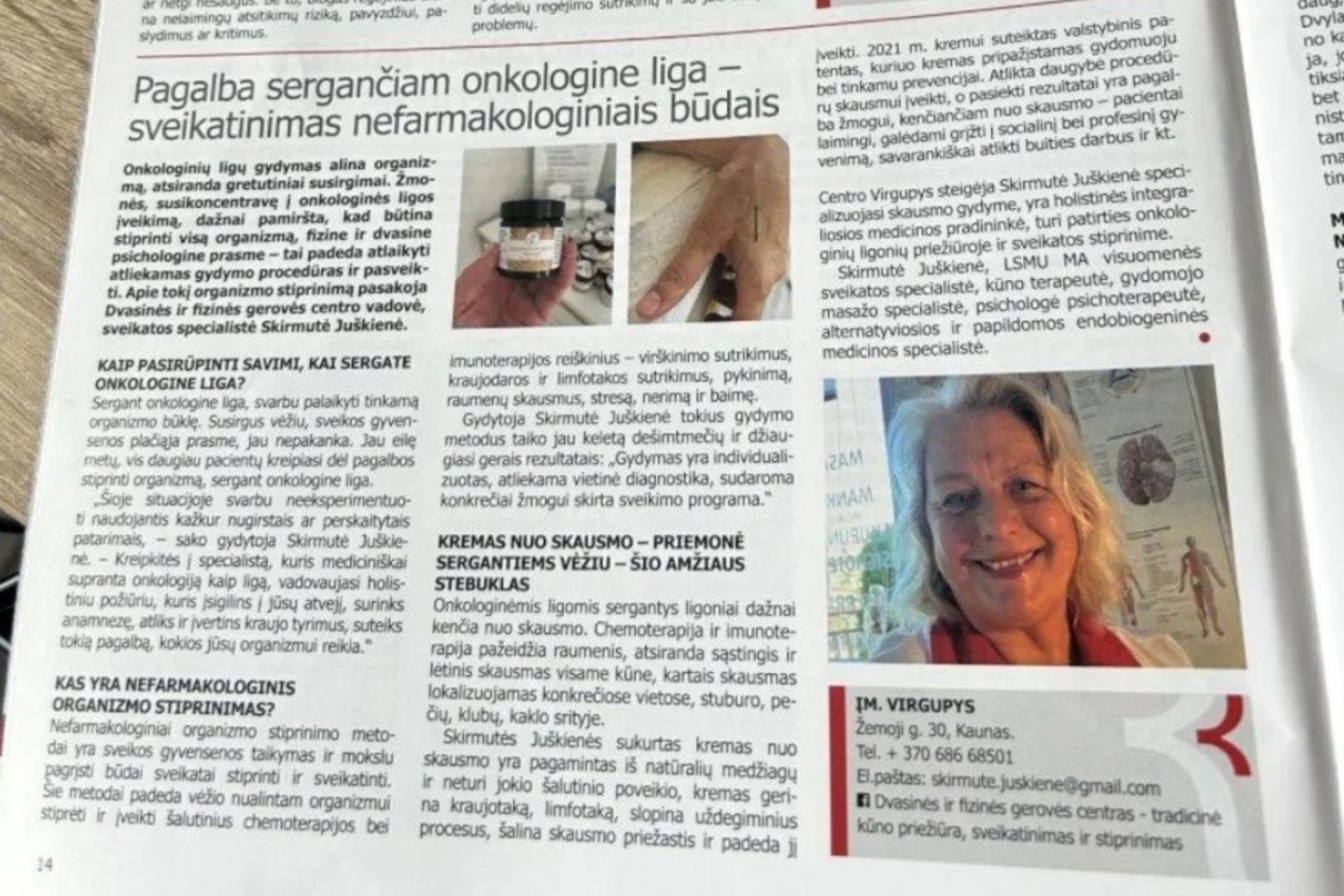 Reklaminiame žurnaliuke „Sveikata Info Jums“ (2025 m., atspausdintas dideliu tiražu ir nemokamai išplatintas įmetant į Kauno miesto ir rajono gyventojų pašto dėžutes), taip pat S. Juškienės įmonės „Virgupys“ Dvasinės ir fizinės gerovės centro bei Onkologiniams ligoniams labdaros ir paramos fondo „Grąža gyventi“ interneto svetainėse skelbiama įdomi informacija.
