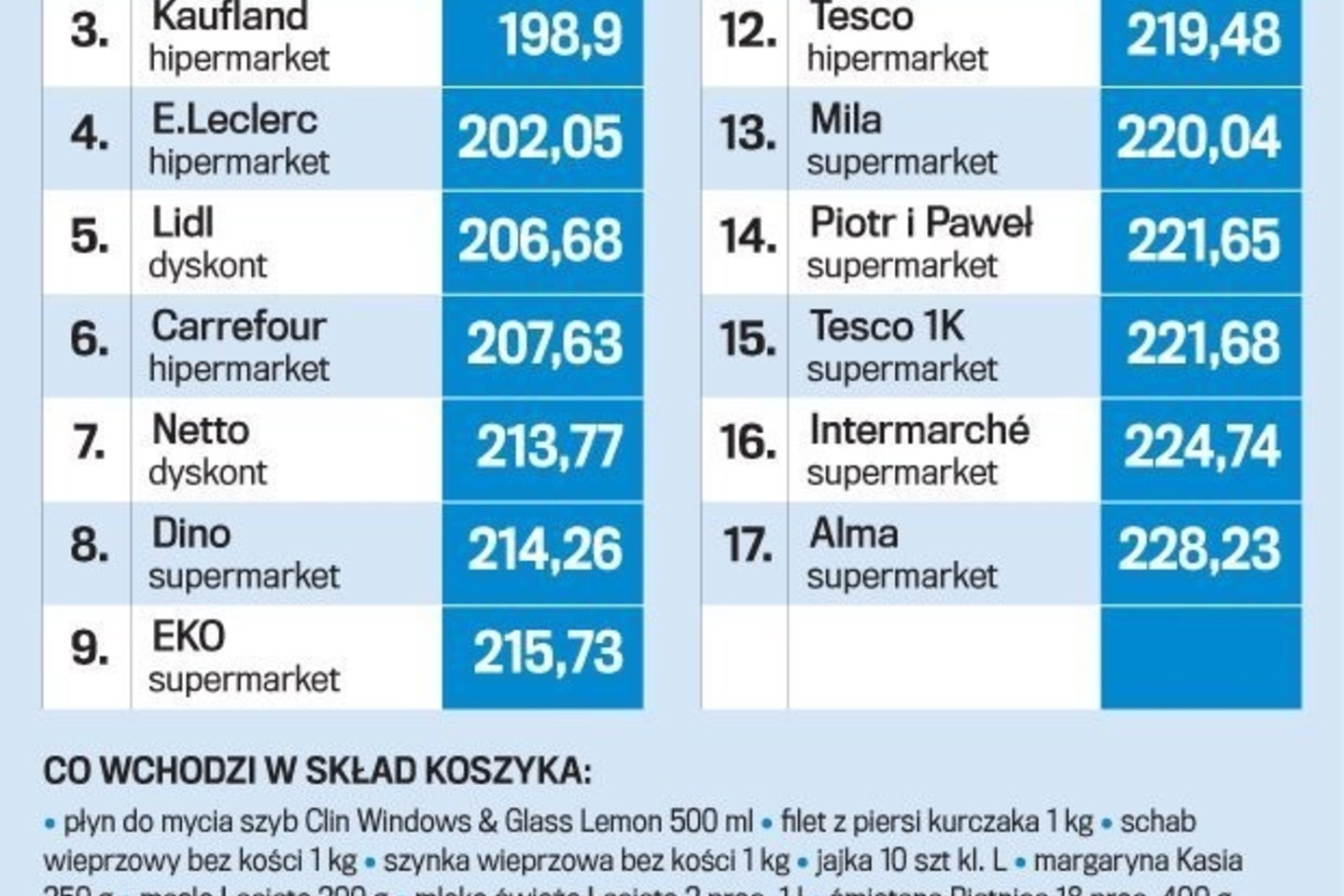 Tačiau svarbu neapsigauti, nes tie, kas išsirinks reitingų lentelėje paskelbtą pigiausią parduotuvę, neretai į pirkinių krepšelį dėsis brangesnes prekes. Mat į wyborcza.pl paskelbtą pirkinių krepšelį (žiūrėti lentelę, – Red.) patenka ne tik įprasti, pirmos būtinybės maisto produktai, bet ir alus, alkoholis, švaros ir kitos prekės.