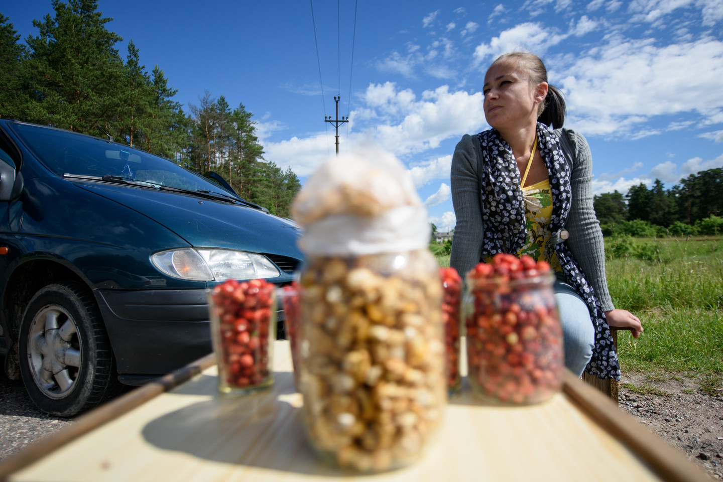 „Žmonės perka, bet sunku surinkti. Su dukra šiandien visą rytą vaikščiojom po mišką, tai radom po du litrus žemuogių ir šiek tiek voveraičių.