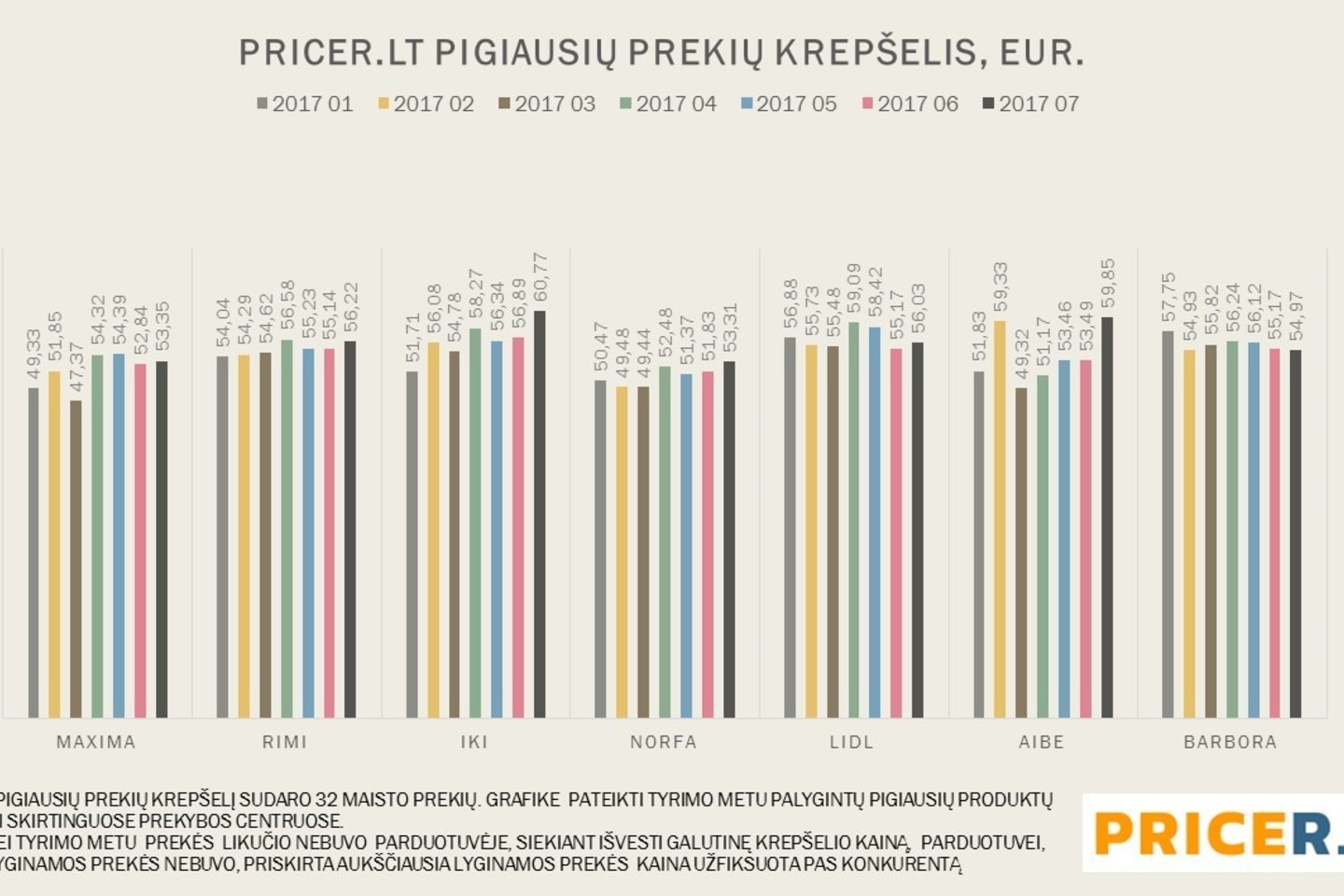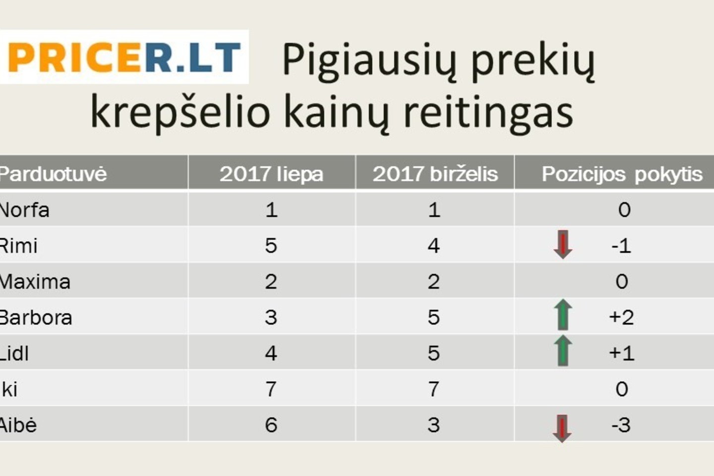 Pigiausių maisto prekių krepšelis, kuris sudarytas remiantis Lietuvos statistikos departamento maisto produktų sąrašu, liepos 11 dieną mažiausiai kainavo parduotuvėje „Norfa“ (53,31 euro), brangiausiai – parduotuvėje „Iki“ (60,77 euro). Krepšelio kainos skirtumas – 7,46 euro. Pirma reitingo vieta, kaip ir birželio mėnesį, atiteko parduotuvei „Norfa“, paskutinė – parduotuvei „Iki“.