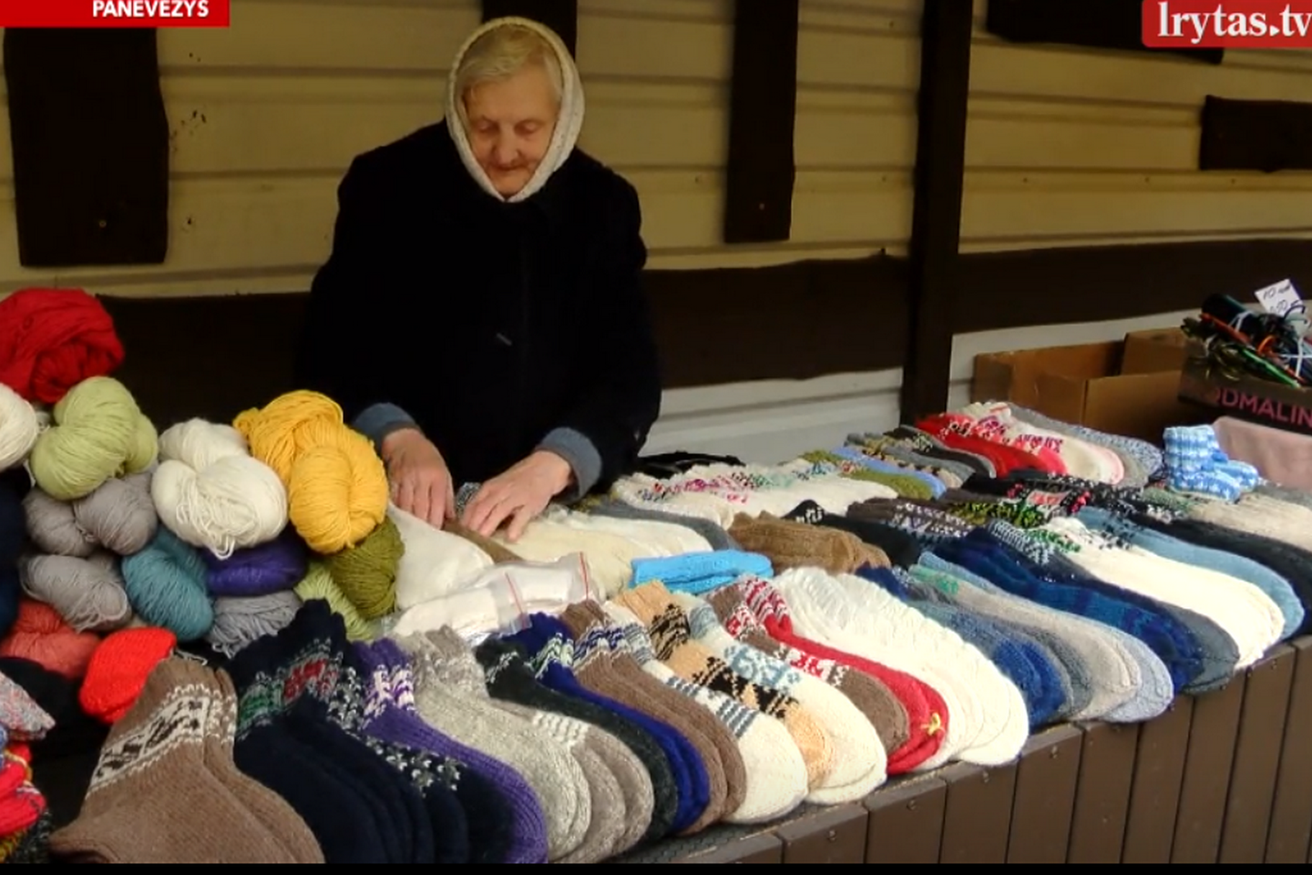 Buvusi ilgametė mokytoja Vanda kasdien Panevėžio turguje prekiauja savo rankų darbo mezginiais.