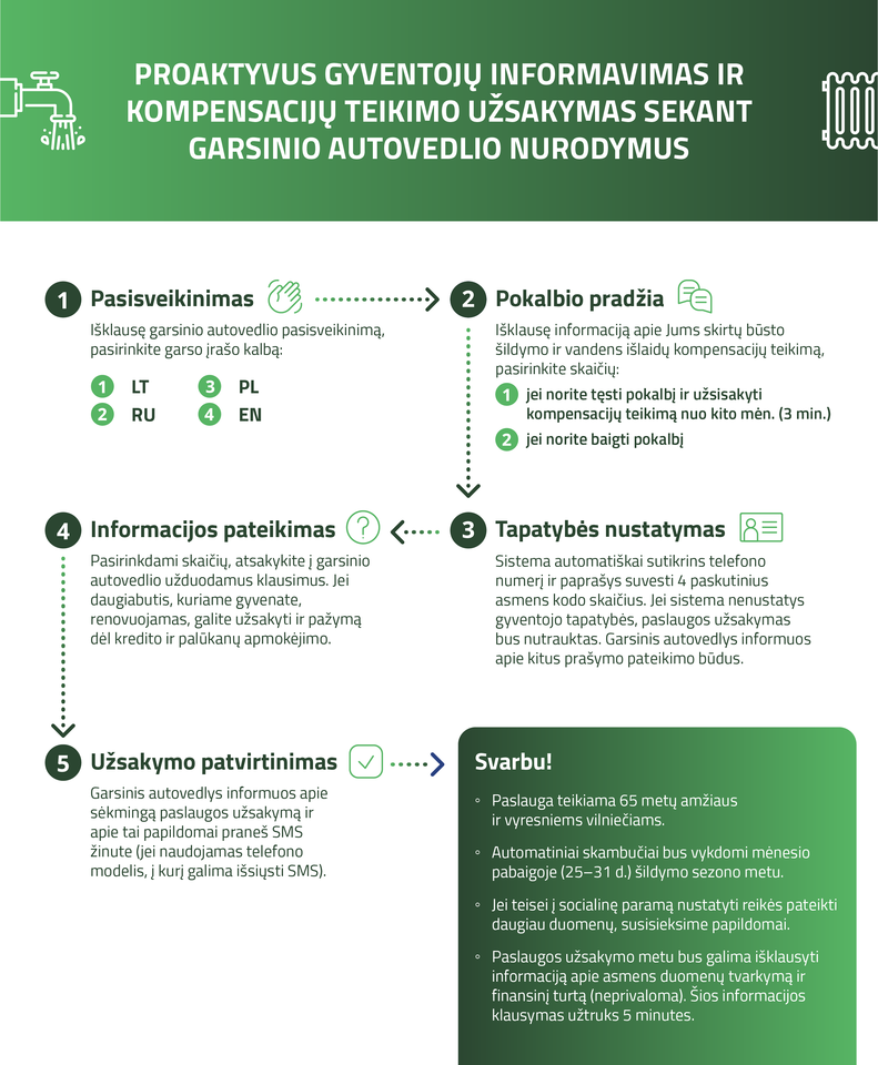 Proaktyvaus autovedlio paslauga vilniečiams bus teikiama lietuvių, rusų, lenkų ir anglų kalbomis. Automatinių skambučių kiekvieno einamojo mėnesio pabaigoje sulauks tik tie senjorai, kuriems baigėsi kompensacijų teikimo laikotarpis.