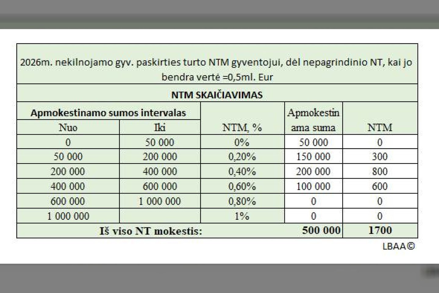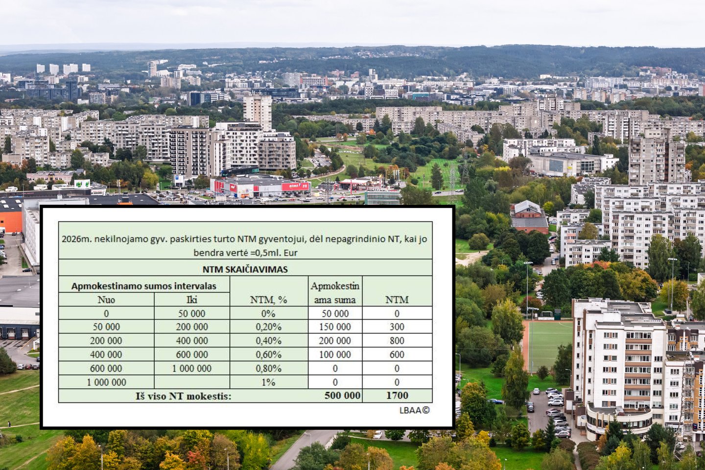 „Kai gyventojas turi kelis gyvenamosios paskirties NT objektus, kurių bendra mokestinė vertė – 0,5 mln. eurų, ir šis turtas nėra pagrindinis būstas. Tokio būsto 2026m. NT mokestis bus 1700 eurų“, – socialinio tinklo „Facebook“ paskyroje skaičiavo asociacija.