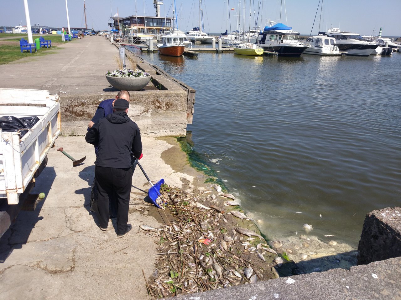 Dar penktadienį su specialiais prietaisais aukštyn pilvus išvertusias žuvis graibstę darbininkai juokavo: „Na štai, pažvejosime ir vešime į |Klaipėdą parduoti“. Paskui prasitarė, kad per dieną tenka porą kartų valyti pakrantes, tačiau žuvų nemažėja.