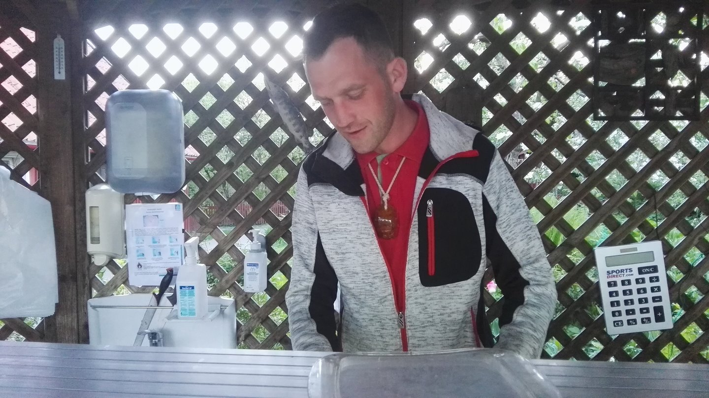 Trumpam iš Anglijos grįžęs šeimininkų sūnus Vitalijus sukosi kaip vijurkas: vienam nešė karšį (mažesnis – 6, didesnis -8 eurai), kitam – upėtakį (12 eurų), ant dar vieno stalo „vartėsi“ ungurys.