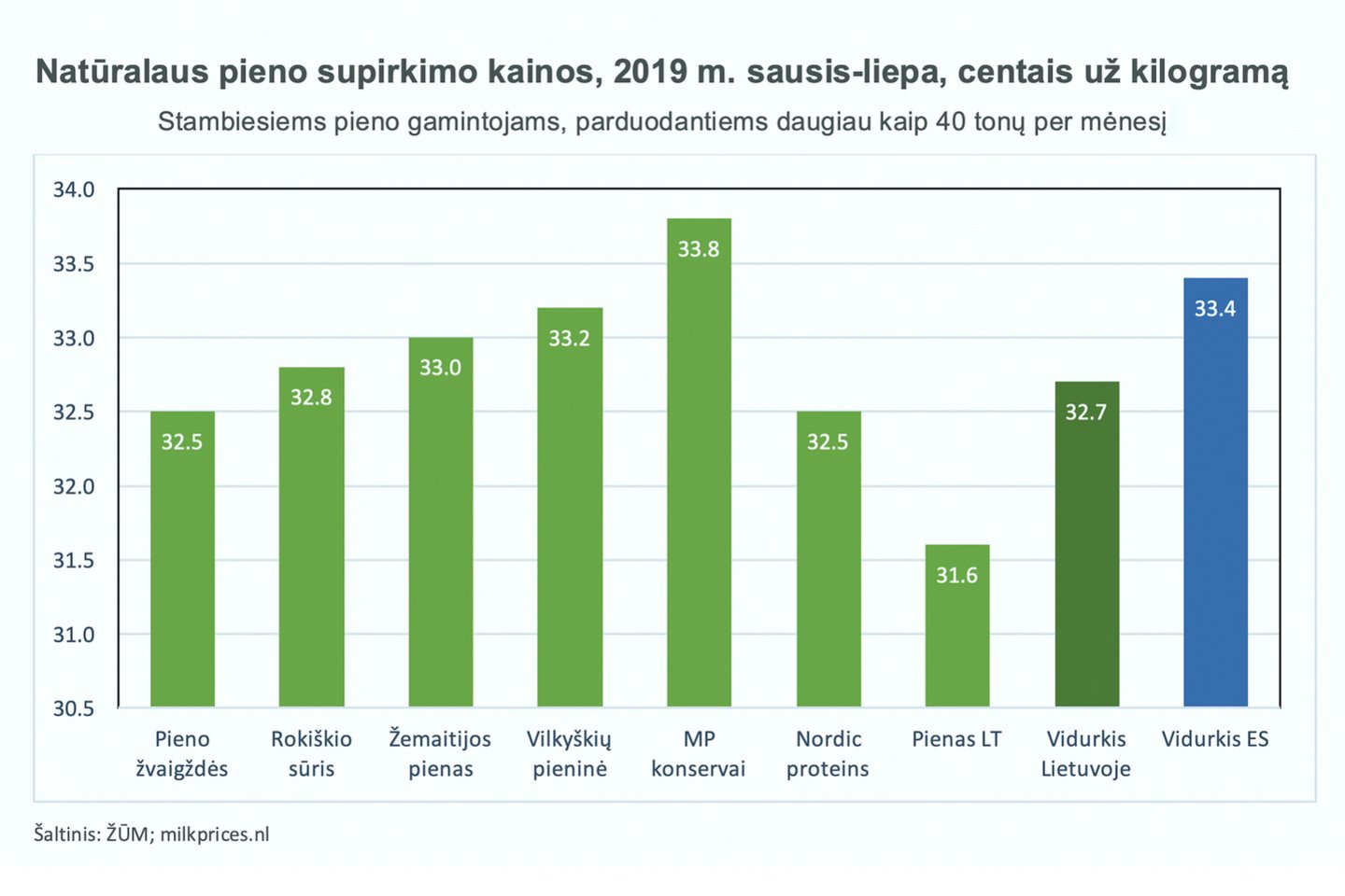 Žemės ūkio ministerijos duomenimis, Lietuvos pieno perdirbimo įmonės už natūralų pieną stambiesiems pieno ūkiams 2019 metų sausio-liepos mėnesiais vidutiniškai mokėjo 32,7 centus už kilogramą.