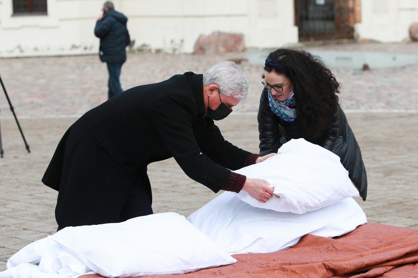 Kaune staliukai ir lova su gedulinga simbolika stovėjo Rotušės aikštėje.