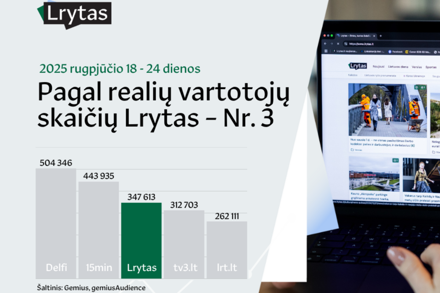 Portalą Delfi praėjusią savaitę skaitė 504 tūkst. unikalių vartotojų, 15min – 443 tūkst., tuo tarpu Lrytas sulaukė 347 tūkst. unikalių vartotojų per savaitę. Toliau rikiuojasi portalas tv3.lt – 312 tūkst. realių vartotojų, po jo – lrt.lt su 262 tūkst. realių vartotojų per savaitę.