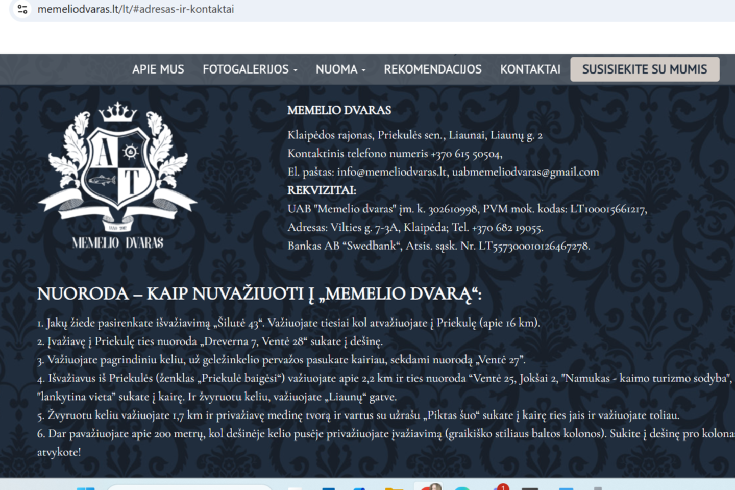 Žvilgtelėjus į portalą rekvizitai.vz.lt matyti, kad UAB „Memelio dvaras“ registruotas Vilties g. 7–3A, Klaipėdoje. Užėjus į nurodytą tinklapį www.memeliodvaras.lt matyti, kad renginiai organizuojami adresu Klaipėdos r., Priekulės sen., Liaunai, Liaunų g. 2.