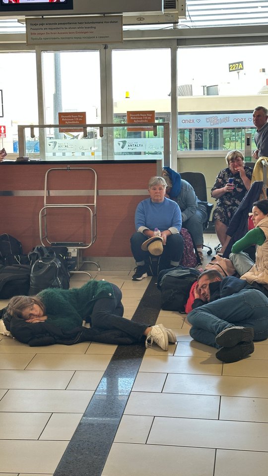 „Nuėję prie registracijos ir norėdami priduoti bagažą, informacinėje lentoje pamatėme, kad mūsų skrydis, turėjęs įvykti 22:50, nukeliamas į 23:50. Pridavę registruotą bagažą ir praėję saugumo patikrą, netrukus sužinojome naujieną – skrydis perkeltas į 06:00 ryto. Bandėme skambinti turizmo agentūros atstovei – niekas neatsiliepė“, – pasakoja Turkijoje iki šiol įstrigęs lietuvis.