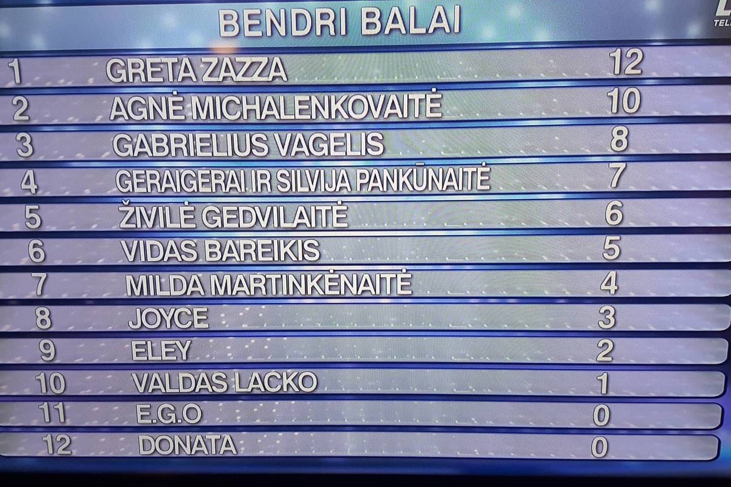 Visa komisijos balų lentelė yra tokia: 1. Greta Zazza (12 balų), 2. G.Vagelis (10 balų), 3. GeraiGerai ir S.Pankūnaitė (8 balai), 4.-5. V.Bareikis ir A.Michalenkovaitė (po 7 balus), 6. M.Martinkėnaitė (5 balai), 7. Evelina Jocytė (4 balai), 8. Eley (3 balai), 9. Ž.Gedvilaitė (2 balai), 10. V.Lacko (1 balas), 11. E.G.O. (0 balų), 12. Donata (0 balų).