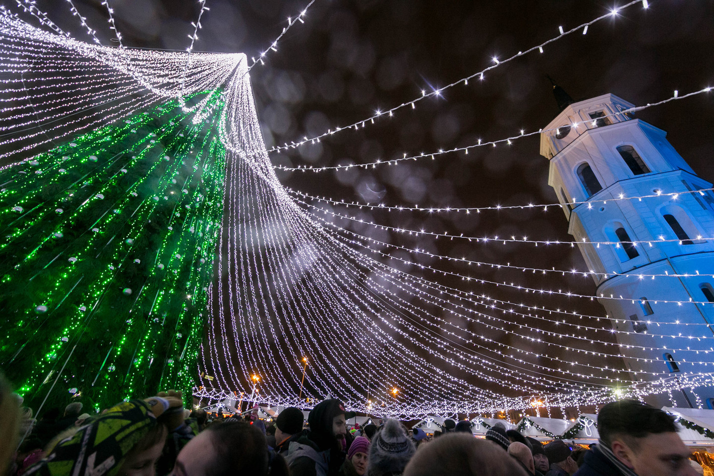 Iki pat įžiebimo akimirkos buvo slepiama, kaip šiemet atrodys Kalėdų eglė. Vieša buvo tik tai, kad iš šakų sukrauta žaliaskarė į aukštį stiebiasi 27 metrus, o kompozicijos plotis – 50 metrų. Papuošti eglei prireikė net 50 tūkst. lempučių.