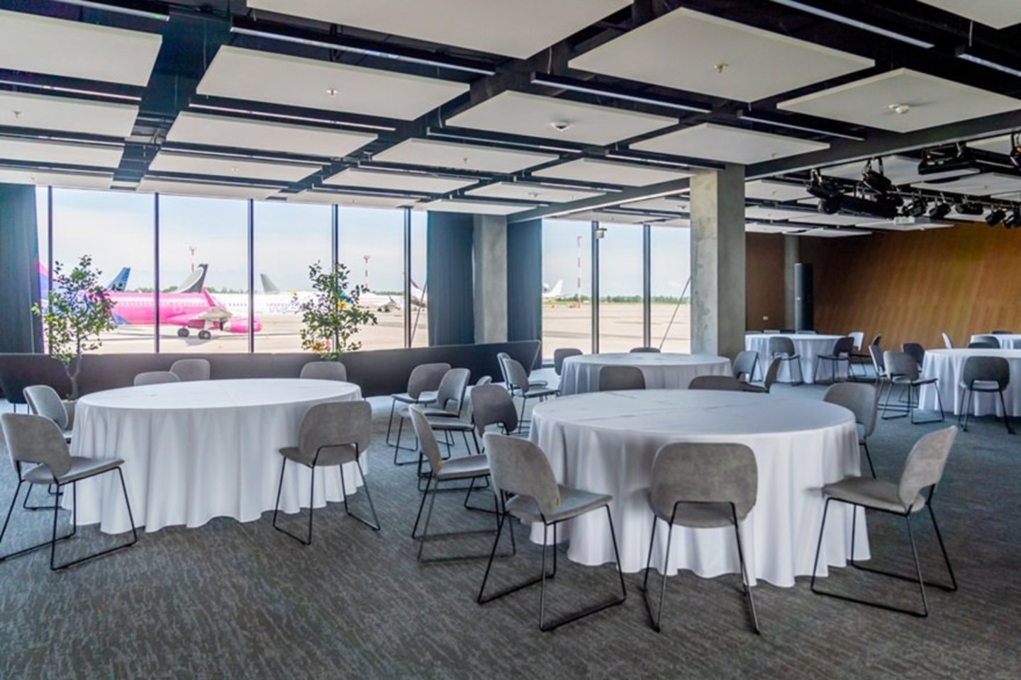 Vilniaus oro uosto konferencijų centras siūlo ne tik išskirtinį vaizdą, kuris neabejotinai palieka įspūdį jaunavedžiams ir jų svečiams, bet ir viską, ko reikia tobulai šventei. Konferencijų centras yra patogioje vietoje, išsiskiria modernia 520 kv. m. erdve, kuri gali būti transformuojama pagal jūsų poreikius. Čia rasite naujų technologijų šviesos ir garso aparatūrą, kuri padės sukurti šventišką atmosferą, reikiamus baldus, tad niekuo papildomai nereikės rūpintis; maisto tiekėjai gali naudotis šiuolaikiškai įrengtomis virtuvės patalpomis. „Lounge“ tipo poilsio zonoje visada malonu atsikvėpti.