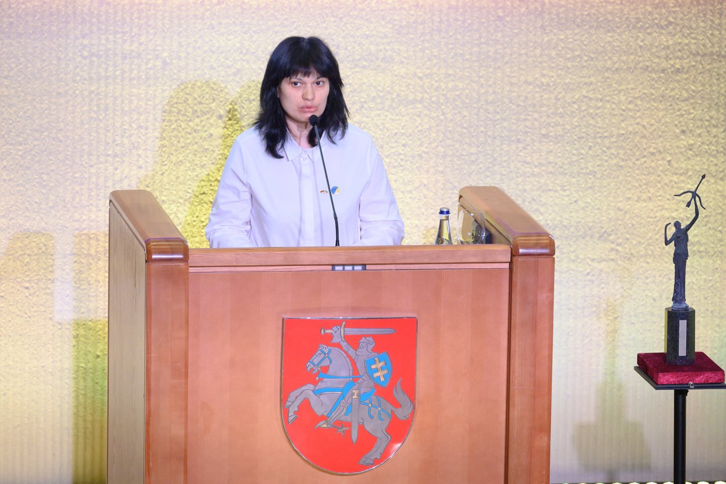 Daugybė Ukrainos miestų dabar subombarduoti, apšaudomi, trinami nuo žemės paviršiaus, griūna vaikų darželiai, mokyklos, gimdymo namai, žūsta niekuo nekalti žmonės, nes jiems neleidžiama pasitraukti net žaliaisiais koridoriais. Lietuviai kaip niekas kitas gerai žino, kaip sunku pasiekti ir išsaugoti laisvę, mes jaučiame jūsų paramą, solidarumą. Mano vaikai ir aš per aštuonerius karo metus pirmą kartą kvėpuojame taikos oru, tačiau taikos sąvoka – labai trapi, tik kartu, tik vieningai, tik susitelkę mes galime laimėti. Šlovė Ukrainai! Šlovė Lietuvai! Šlovė didvyriams!“