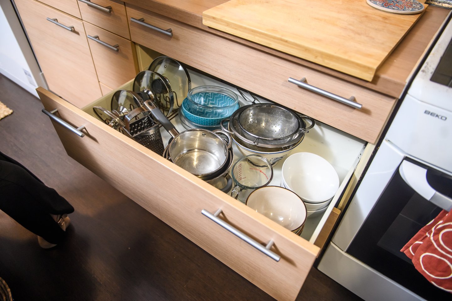 „Maistas turi būti arba apvaliose talpyklose, arba ant laiptelių. Prieskoniai visada turi būti dėžutėje arba keliauti į stalčių. Birius produktus visada susipilam į peršviečiamas taras, nes tada matom kiek turim ir perkam kai pasibaigia. Drabužių spintoje marškinėlius lankstome Marie Kondo stiliumi, nes atsidarius stalčių ar dėžutę juos lengva matyti ir paimti. Jei tokio lankstymo būdo nežinai, spintą tvarkaisi nuolat. Aš spintą paskutinį kartą tvarkiausi – niekada“, – patarimais dalinosi Jovita.