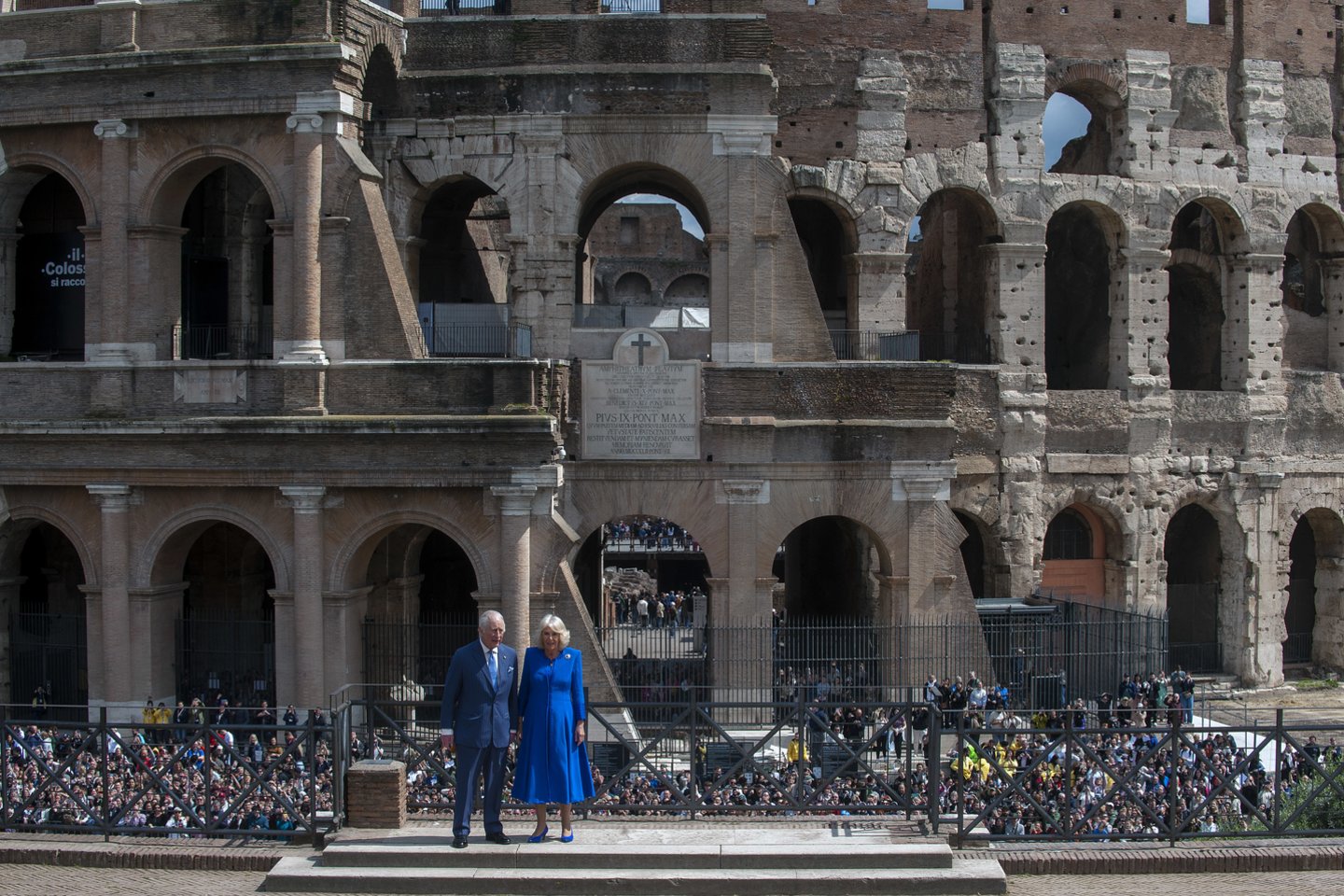 Karalius ir karalienė, atvykę keturių dienų valstybinio vizito į Italiją, prieš pasisveikindami su šeimininkais, tarp kurių buvo ir Italijos kultūros ministras Alessandro Giuli, pamojavo Koliziejaus aikštėje susirinkusiems žmonėms, sveikinosi su visuomene, spaudė rankas vietos mokyklų moksleiviams.
