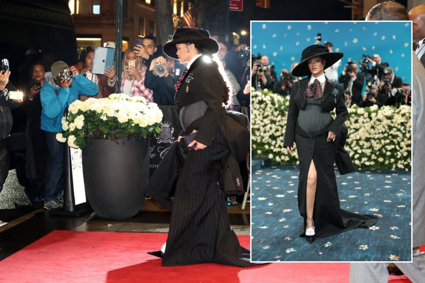 Mat pokylyje „Marc Jacobs“ moterišku smokingu pasipuošusiai Rihannai net nereikėjo nieko sakyti: jis išryškino jau didelį nėštukės pilvuką.