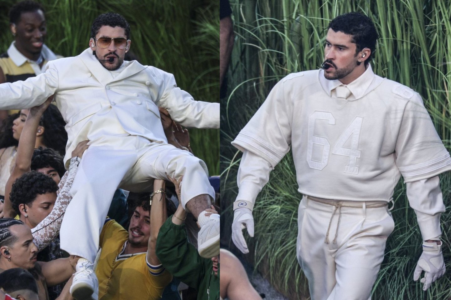 Tik pasirodymo viduryje, kai Bad Bunny grįžo į sceną duetui su Lady Gaga, vilkėdamas plačių pečių, balkšvą kostiumą su kaklaraiščiu, „Zara“ oficialiai patvirtino, kad būtent šis prekės ženklas kūrė abu įvaizdžius. Stilistų Stormo Pablo ir Marvino Douglaso Linareso sukurti drabužiai buvo siūti pagal užsakymą. Palyginimui, įprastas „Zara“ kostiumas parduotuvėje kainuotų apie 250 svarų sterlingų.
