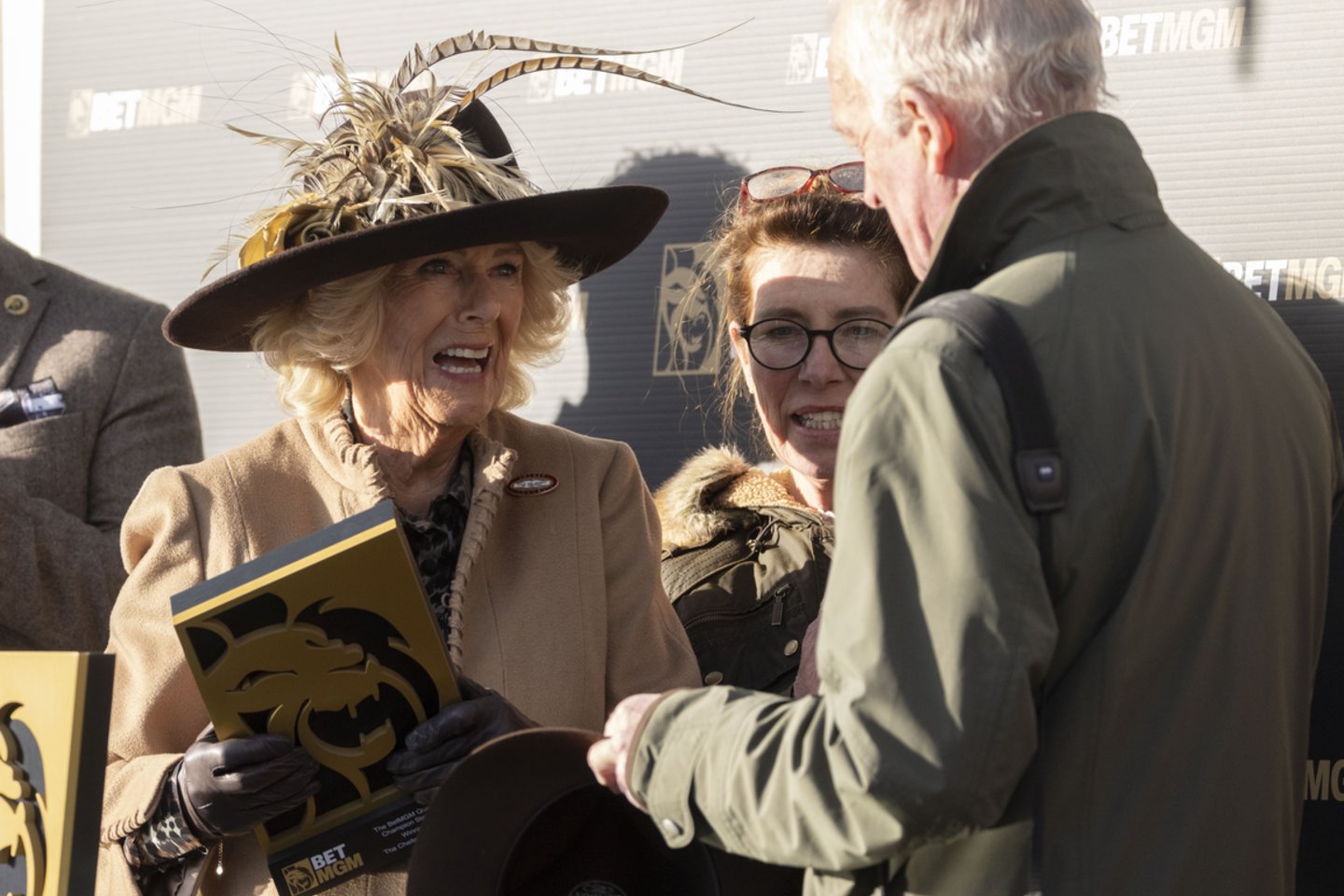 Karalienė Camilla vilkėjo medaus spalvos kašmyro paltą, kurtą dizainerės Anna Valentine, Philip Treacy skrybėlę ir segėjo „Jockey Club“ ženklelį. Tačiau dėmesį kaustė jos skrybėlė – ji derėjo prie įvaizdžio ir buvo puošta įspūdingomis plunksnomis.