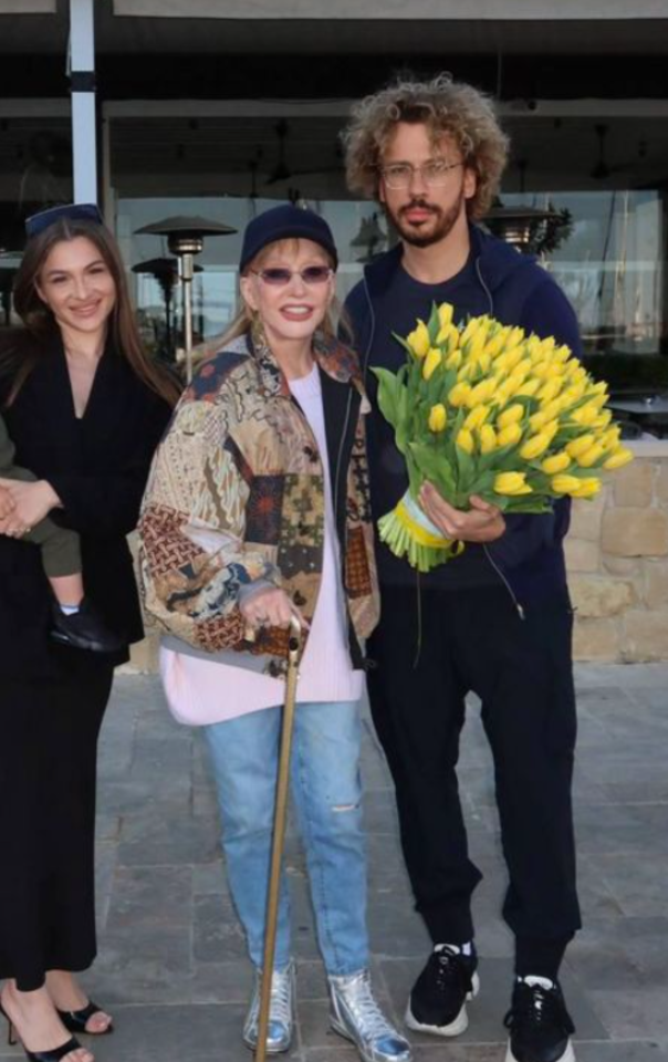 76-erių A. Pugačiova laiką leido kartu su vyru komiku Maksimu Galkinu bei moterimi, rankose laikiusia mažą vaiką.