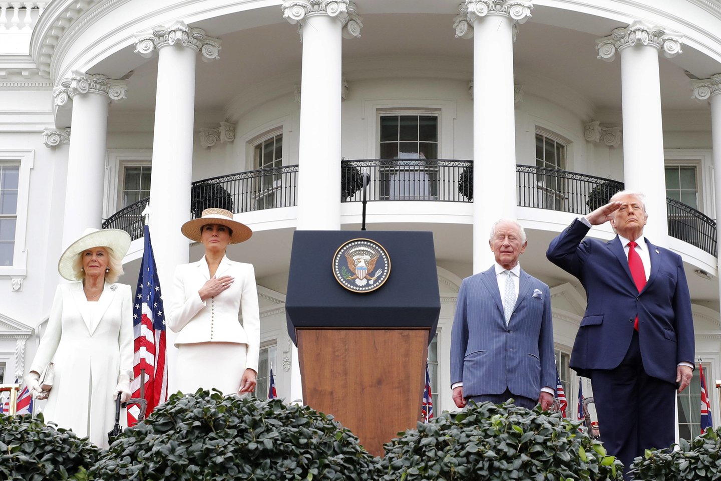 Prieš kalbą prezidentas D.Trumpas ir pirmoji ponia M. Trump iškilmingai pasitiko karalių Karolį III bei karalienę Camillą.