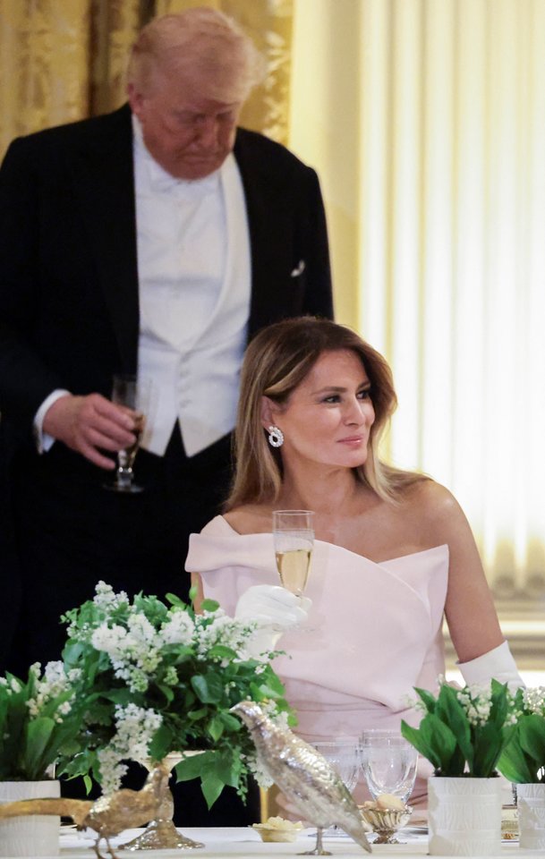 56-erių Melania vilkėjo šviesiai rožinės spalvos šilkinę „Christian Dior“ suknelę be petnešėlių, kurią derino su balkšvomis „Dior“ zomšinėmis pirštinėmis. Įvaizdį vainikavo tos pačios spalvos šilkiniai „Dior“ aukštakulniai.