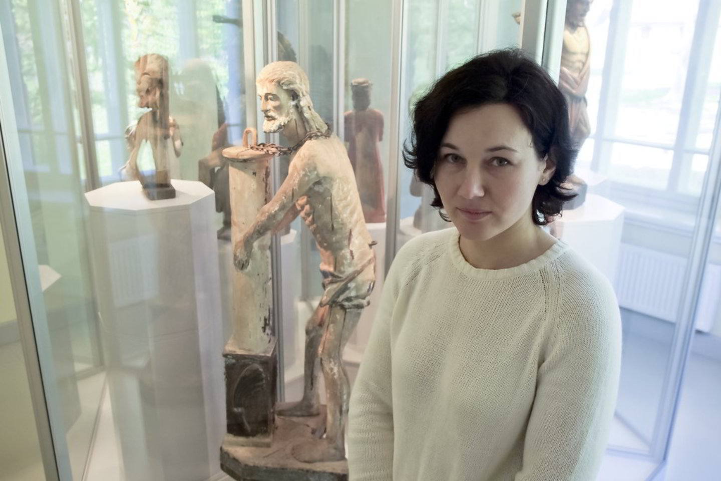 „Šitas angelas yra mano tėtis“, - sako Rasa, atsistojusi šalia vienos iš dekoratyvinių angelų galvų iš Sintautų bažnyčios altoriui papuošti sukurtos skulptūrinės kompozicijos.