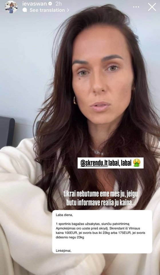 „Esame oro uoste, bet žinokit, aš esu labai pikta ir labai nusivylusi situacija, kuri ką tik įvyko. Vežamės mes banglentes į tam tikrą šalį, vėliau pasidalinsiu, į kurią. Pirkome bilietus per Skrendu.lt. Labai dažnai pirkdavau ten bilietus, bet, manau, kad šis kartas buvo paskutinis.