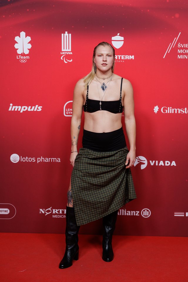 Ant raudonojo kilimo R.Meilutytė pasirodė pasipuošusi jai nebūdingai. Dažniausiai juodus kostiumus per apdovanojimus vilkėjusi plaukikė juos iškeitė į... originalią juodą liemenėlę ir parodė savo pilvo presą.