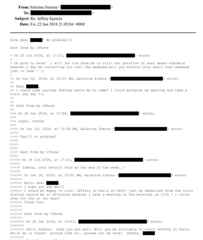 2019 m. sausio 23 d. J.Epsteino aplinkos atstovė rašo: „Susitikimas šeštadienį Paryžiuje tiktų. Ar galėtumėte patikrinti traukinių tvarkaraštį ir ar galėtumėte susitikti apie 14:00 val. Jeffrey Paryžiaus apartamentuose?“