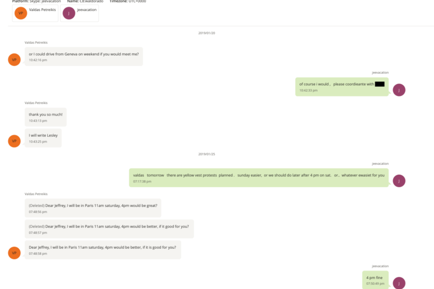2019 m. sausio 20–23 d. vyko elektroninis susirašinėjimas tarp Valdo Petreikio ir Jeffrey Epsteino aplinkos atstovų dėl galimo susitikimo Paryžiuje.