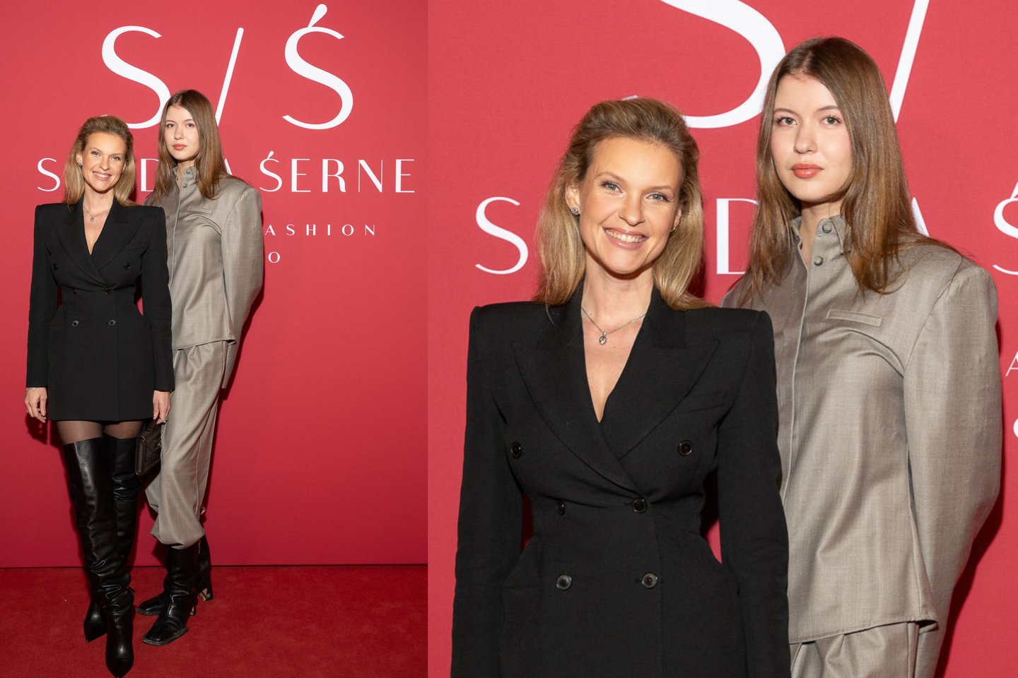 Vilma rinkosi juodą švarko tipo suknelę, prie kurios priderino ilgus ilgaaulius batus, jos dukra Greta vilkėjo smėlinį dviejų dalių kostiumėlį.