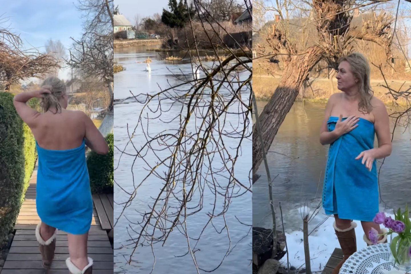 Kovo 12-ąją, kai šalį lepino pabvasariška saulė, Ekrane visi išvydo ją apsigaubusią rankšluoščiu ir avinčią ilgaaulius.