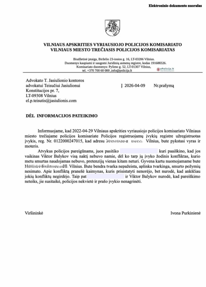 Oficialiame Vilniaus policijos komisariato dokumente nurodoma, kad įvykis fiksuotas 2022 m. balandžio 29 d.