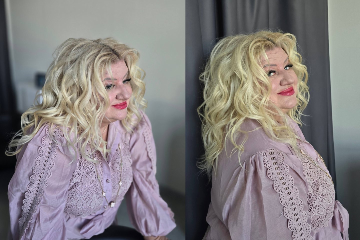 Šį kartą Dainai parinkta garbanotų plaukų šukuosena, o jos veidą puošė subtilus makiažas, kurio akcentu tapo ryškios lūpos.